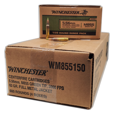 This XM855 ammunition from Winchester is loaded to NATO specifications. It features a 62 grain projectile with a steel penetrator core making it unsafe in most indoor ranges. This ammo is Lace City brass cased, reloadable, non-corrosive and boxer primed. Wincehster 5.56 NATO is packaged in boxes of 150 Rounds or Cases of 600 Rounds.